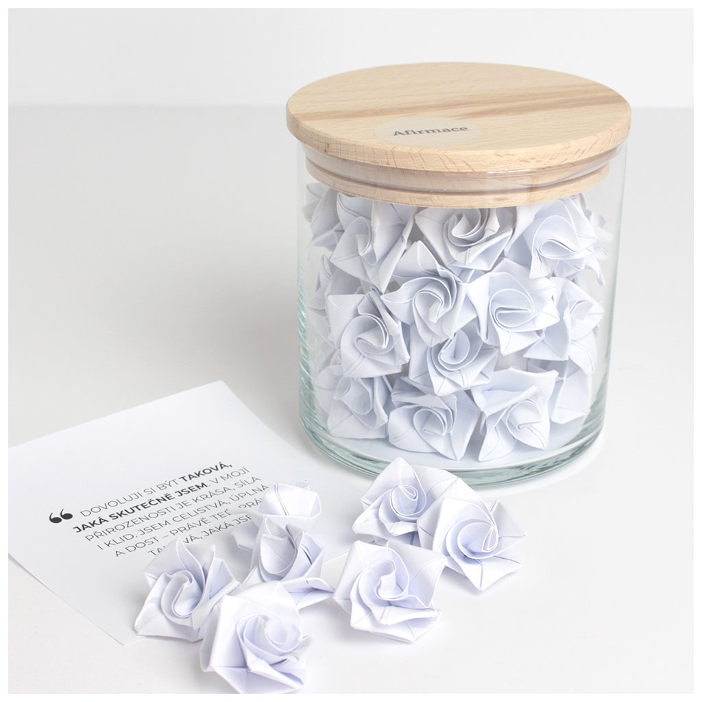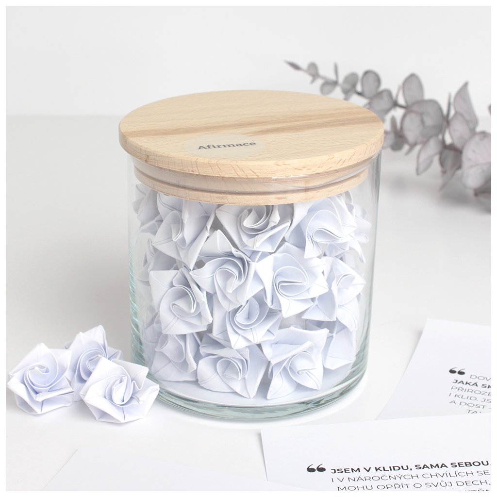 Sklenice s citáty je originálním doplňkem pro váš každodenní rituál Afirmace. Obsahuje 31 pečlivě vybraných vzkazů, které jsou složeny do tvarů origami kytiček. Každý den vám přinese jemné povzbuzení, radost i klidnou energii.