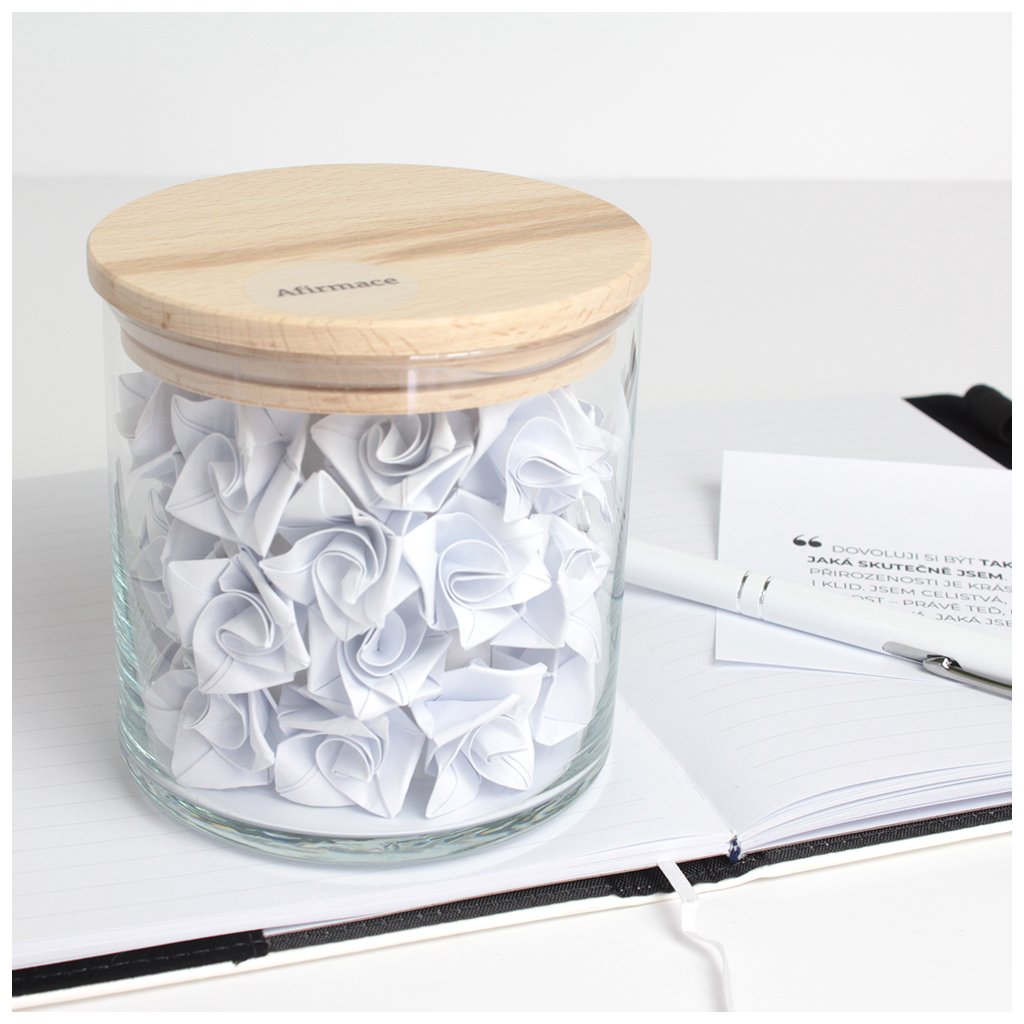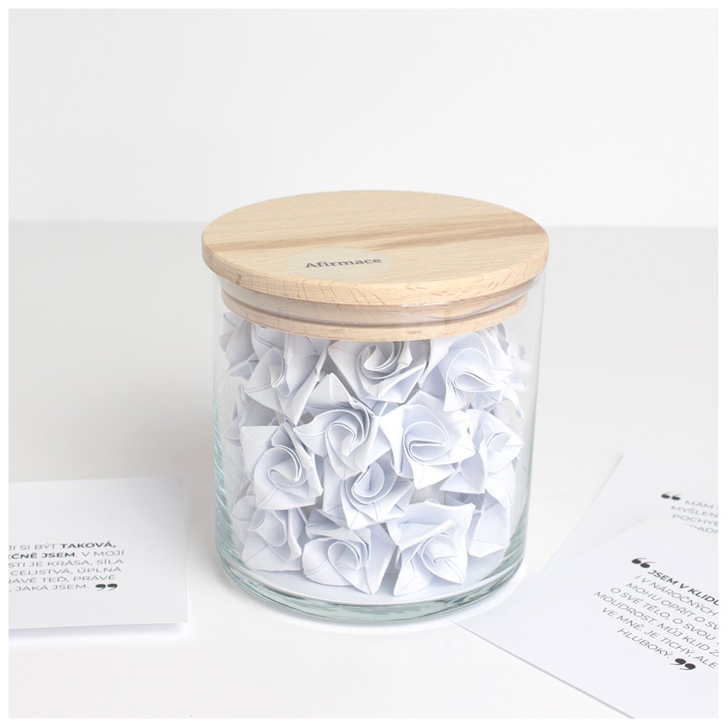 Objevte kouzlo jemných rituálů s naší Sklenicí s citáty. Uvnitř najdete 31 pečlivě vybraných textů, které byly složeny do tvarů origami – kytiček, jako symbol růstu. Každý den si můžete rozložit jeden z nich a nechat se inspirovat afirmací, která podpoří váš vnitřní klid, sebevědomí a radost. Afirmace jsou krátké, pozitivní věty, které si opakujeme, abychom podpořili své myšlení, sebevědomí a vnitřní naladění. Pomáhají nám přesměrovat pozornost od pochybností k důvěře v sebe a život. Sklenice Afirmací je nejen krásným interiérovým doplňkem, ale i praktickým pomocníkem na cestě k vědomějšímu životu.