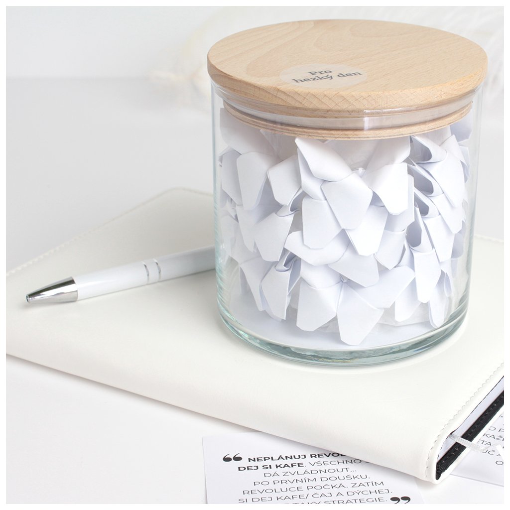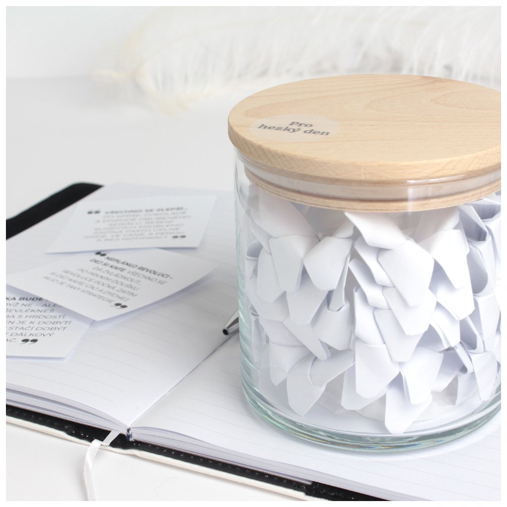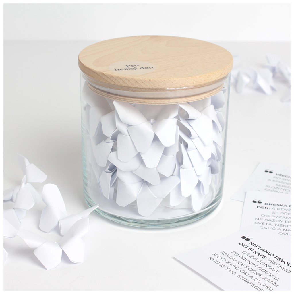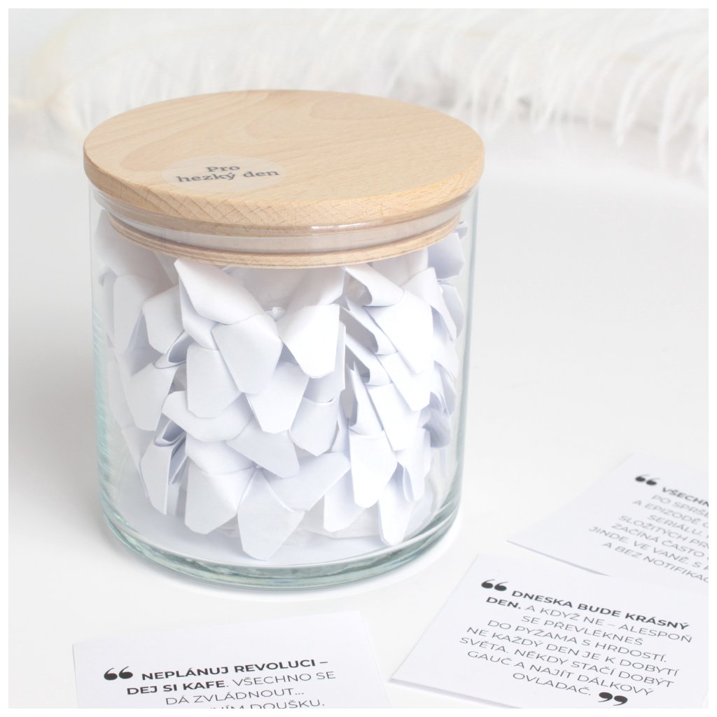 Sklenice „Pro hezký den“ ukrývá 31 citátů, pečlivě poskládaných do origami motýlků. Každý den si můžete rozbalit jeden a nechat se unést jemným poselstvím, které vám vnese radost a nadhled. Sklenice je krásným doplňkem vašeho domova i srdcem rituálu Pozitivní mysl.