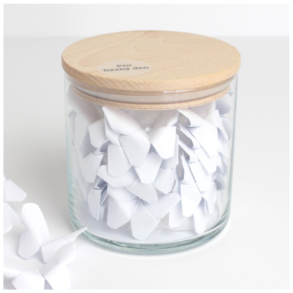 Materiál: papírové origami, čiré sklo a dřevo (sklenice s víčkem)