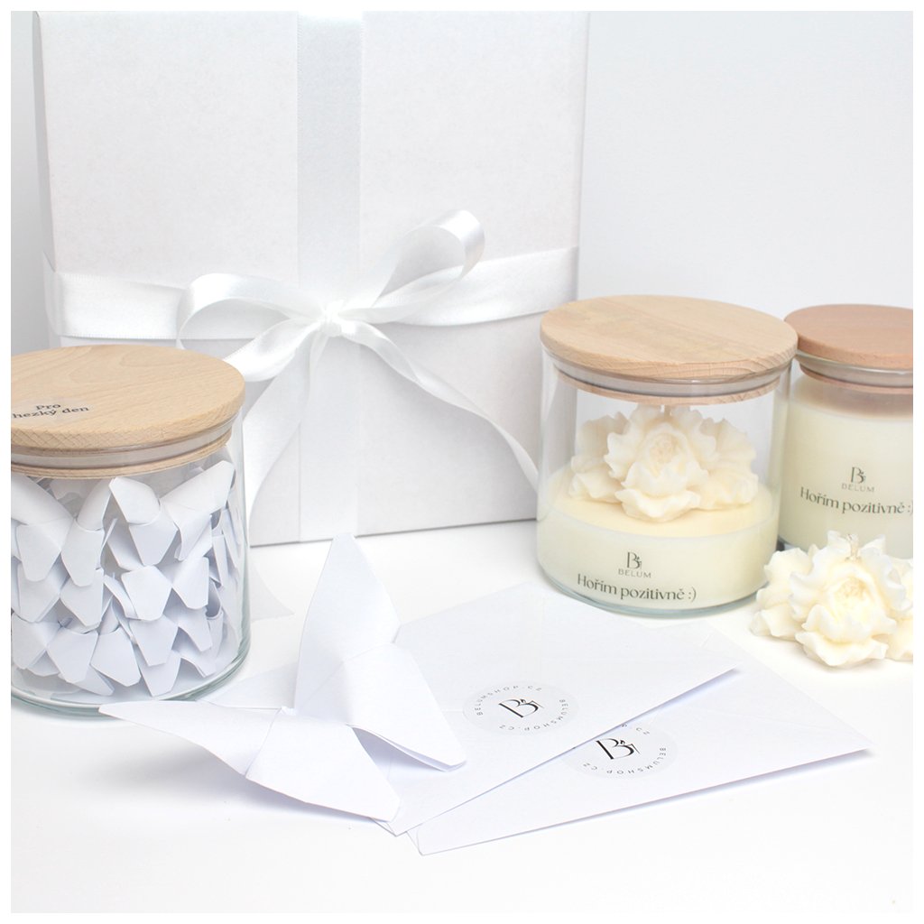 Velká dárková sada Pozitivní mysl je pečlivě sestavený rituál, který vás jemně provede cestou k radosti, vděčnosti a optimistickému pohledu na svět. Obsahuje sklenici Pro hezký den - s 31 origami citáty, které vám každý den nabídnou nový důvod k úsměvu a povzbuzení. Tři ručně vyráběné sojové svíčky vytvářejí klidnou a harmonickou atmosféru, zatímco origami motýl symbolizuje lehkost a proměnu (na stole pro vás bude připomínkou rituálu). Průvodce rituálem vás krok za krokem povede, jak s jednotlivými prvky pracovat a naplno si užít tento jedinečný zážitek. Součástí sady je také osobní vzkaz, který dodá rituálu hloubku a citlivost. Tento set je nejen dárkem pro blízké, ale především pozvánkou k pravidelnému naladění na pozitivní myšlení a vnitřní klid.